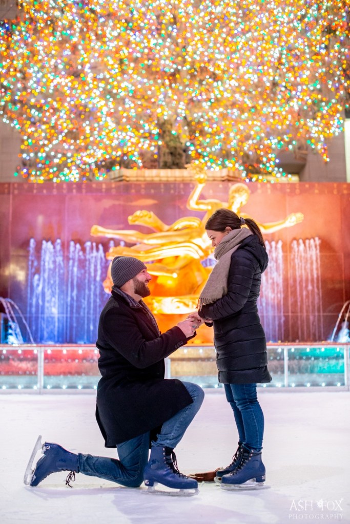 So here we are, 10 hours after my first surprise as we skated casually around Rockefeller Skating Rink, Alec asked to take a selfie which I thought was a little weird because he’s not a selfie guy.. Future me would find out that he used the photo to send to the photographer that was set up to catch the final moment. I tried to talk to him a couple times but ended up answering my own questions as he was on a completely different planet and probably had a couple more important things to go over in his head. So, we continued to skate until everyone cleared the ice and he wanted to go around one more time together. Then ‘Our Song’ began playing. Literally ‘Our Song” By Elton John. I instantly started crying as he dropped to his knee with the biggest smile on his face and confessed his love to me. Of course, I said YES! After the moment passed, we both realized the crowd above cheering and looked up to the chant “kiss her”. It was a magical moment I will remember forever. Now for anyone who has been to the Rockerfeller Rink around Christmas knows that at any given time there are thouuusands of people watching the rink. We had thousands of people watching and cheering. I loved it, always loved to put on a good show.