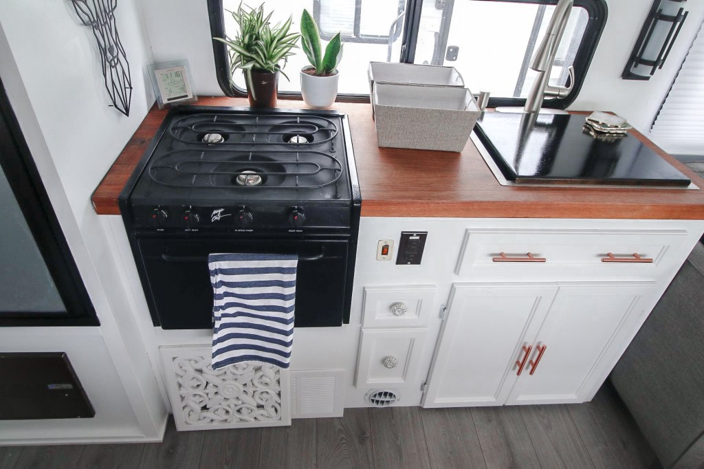 This part of the motorhome had a pretty major overhaul. The countertops were taken out – Stove is original to the motorhome however, I spray painted the top recently from a beige to black. Spray paint was rated for extreme heat so we have no issues with cooking. We installed a large, deep sink which caused us to loose a lot of storage underneath but I think it is totally worth it. Along with the sink shiny new faucet was also replaced and a new light fixture. The fridge was a super easy fix I found online and will go into further detail below.