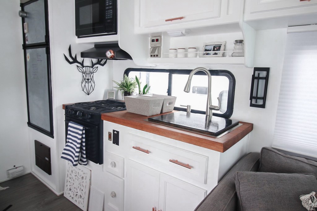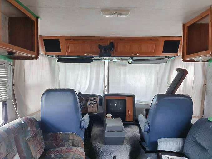 It’s been 3 years since the original gut job I did with the motorhome. Alec originally had gone to look at the motorhome without me while I was working on a pipeline project. He came back and said the price was perfect and we should pursue buying it, I was absolutely thrilled as I had spent the last 6 months searching on Kijiji. I vividly remember the first time I saw it, I thought to myself – what an ugly brown and blue camper, I cannot wait to transform this into beautiful home on wheels. I started explaining to Alec my never ending plans, I’ll paint this white, rip out that, put a table here, new chairs, new sink.. definitely take out this god awful couch… all while he looked at me wide eyed and said –” That seems like a lot of work, I like it the way it is too… if you don’t feel like re-doing it?” I don’t really think Alec knew me yet to the extent of my absolute LOVE of painting everything white and taking something ugly and turning it into beauty.